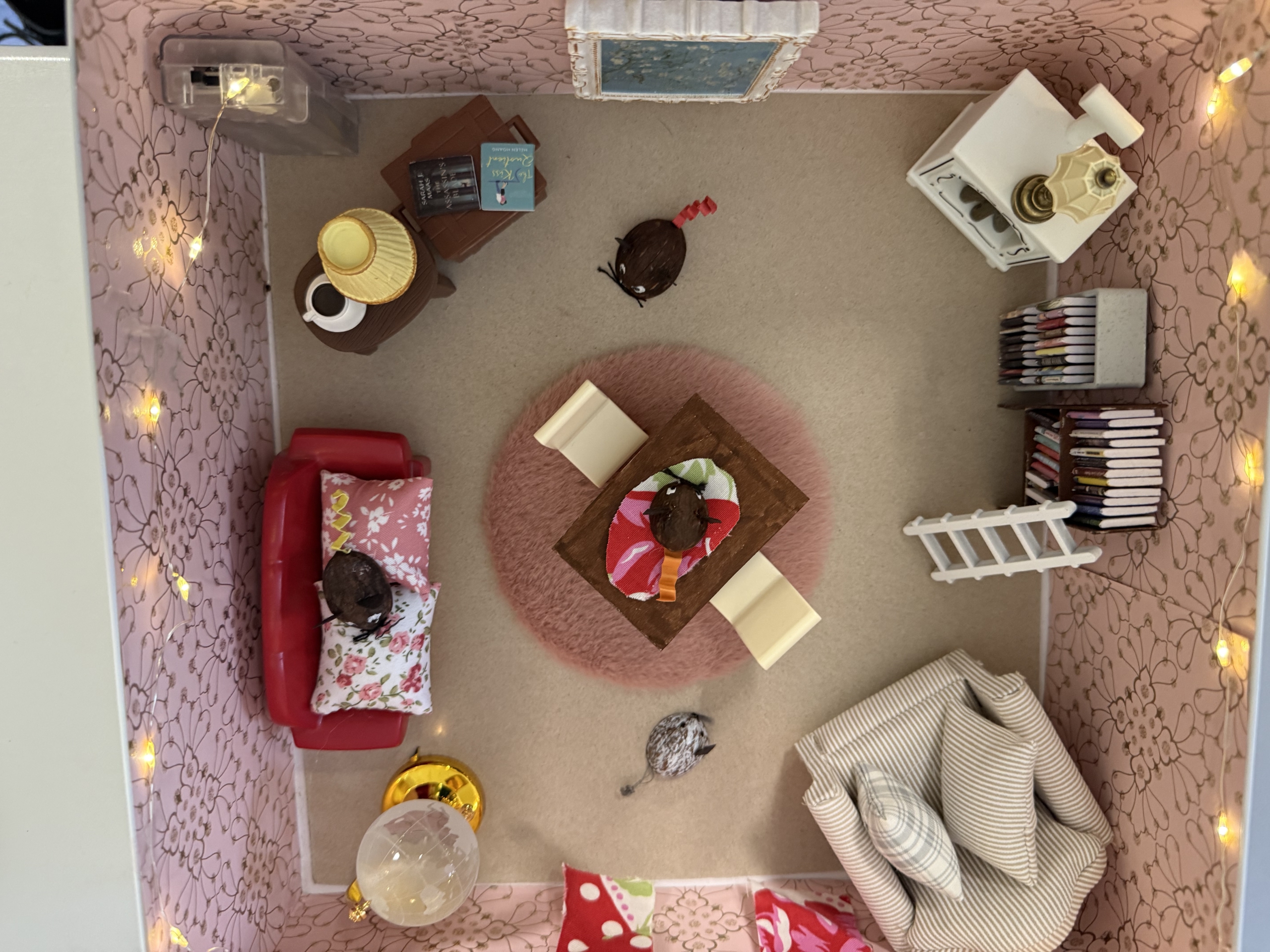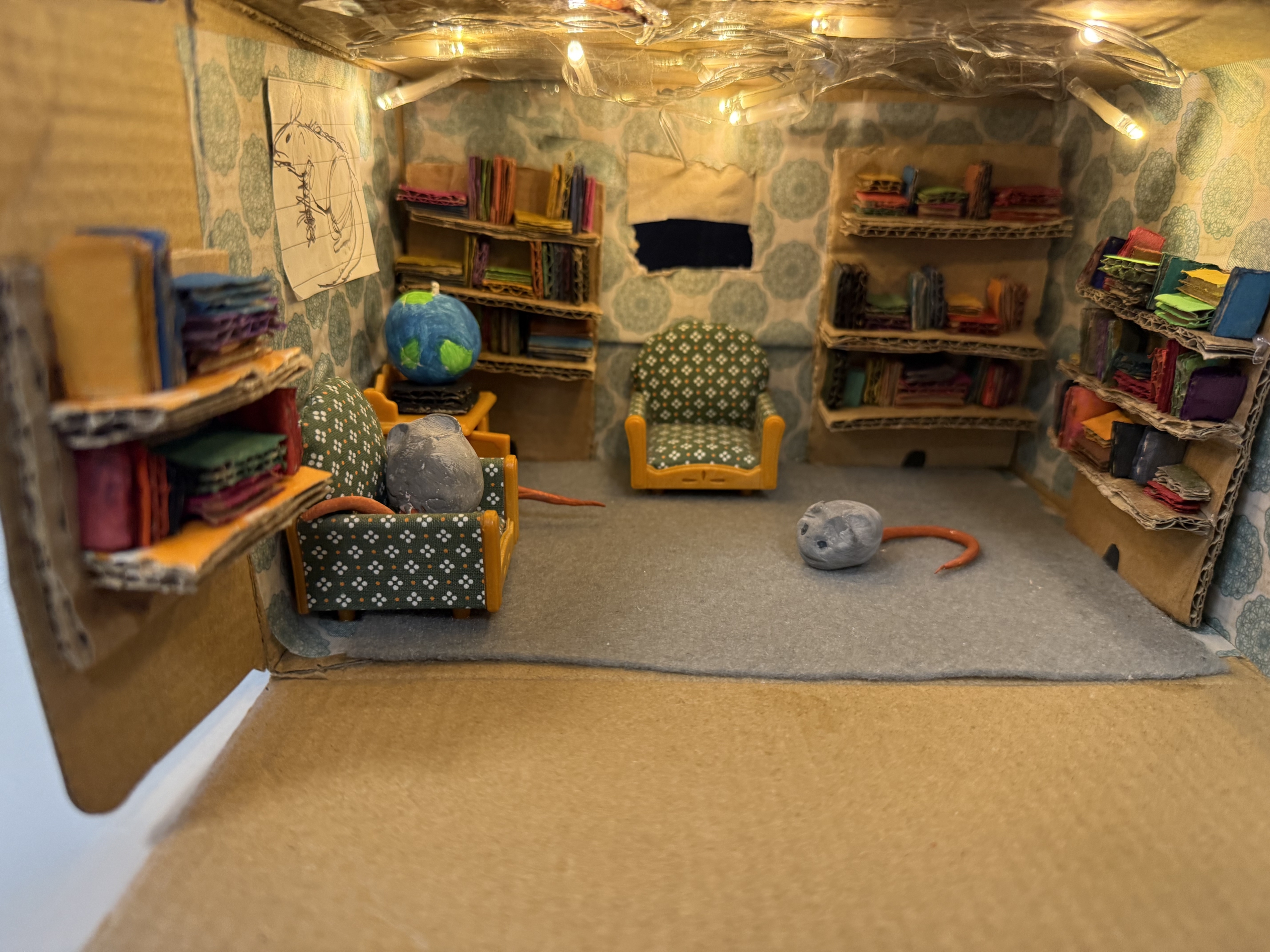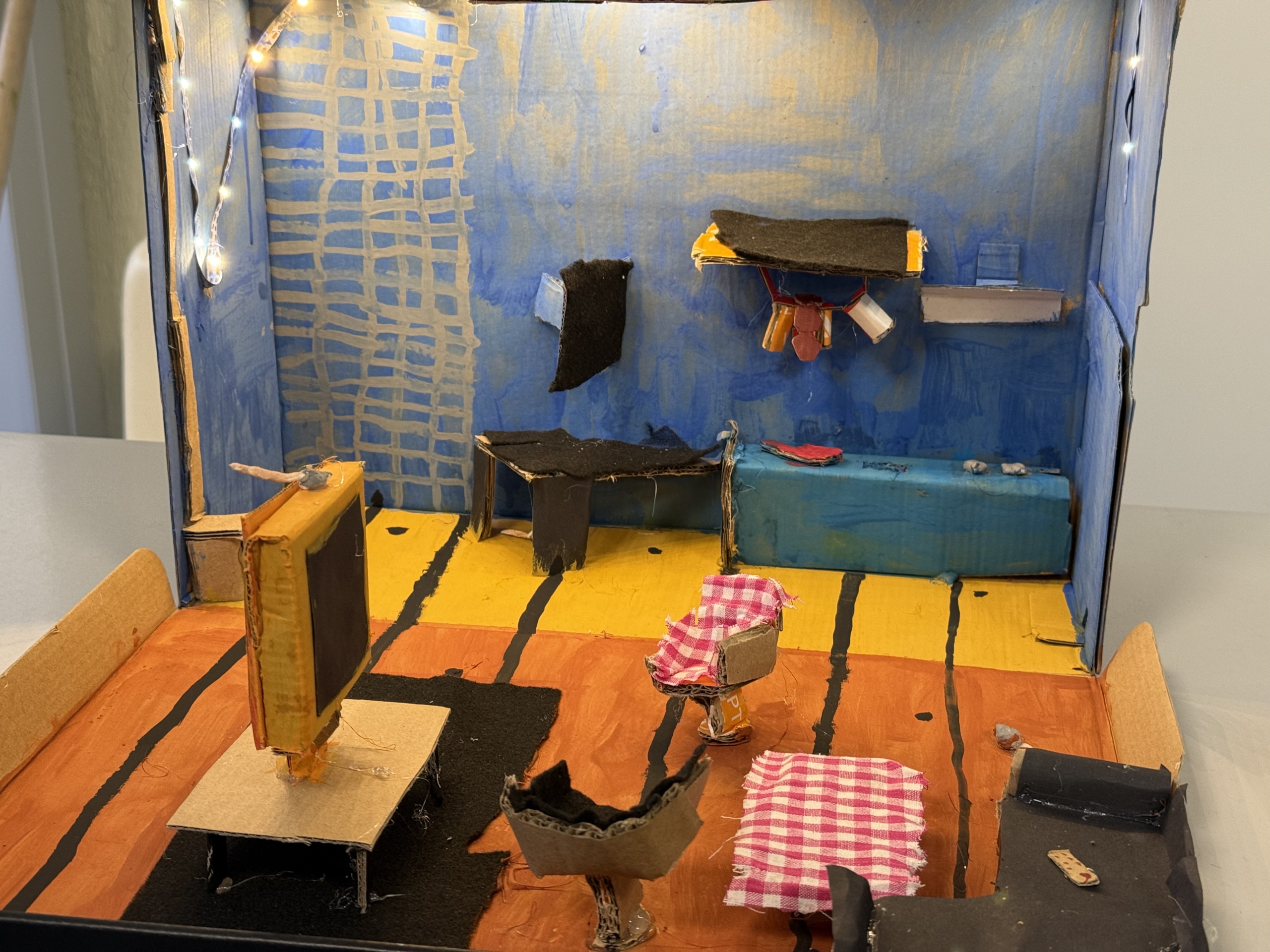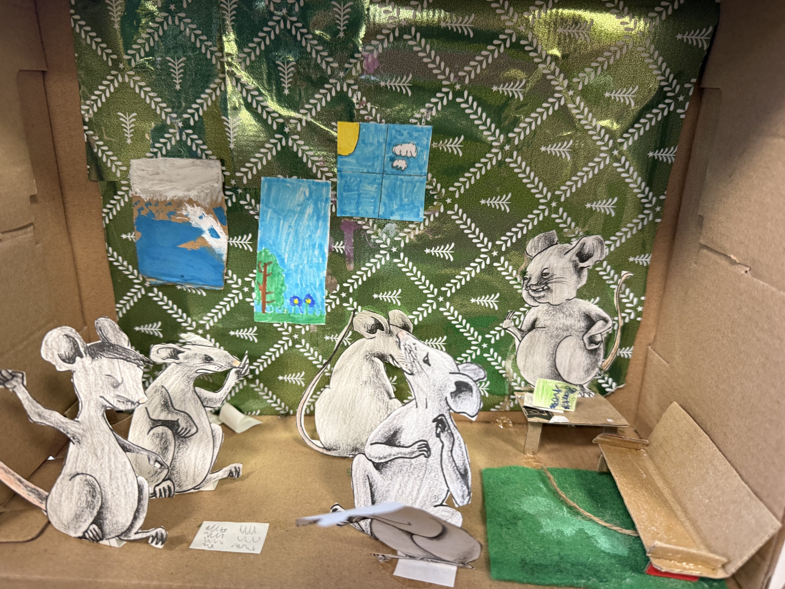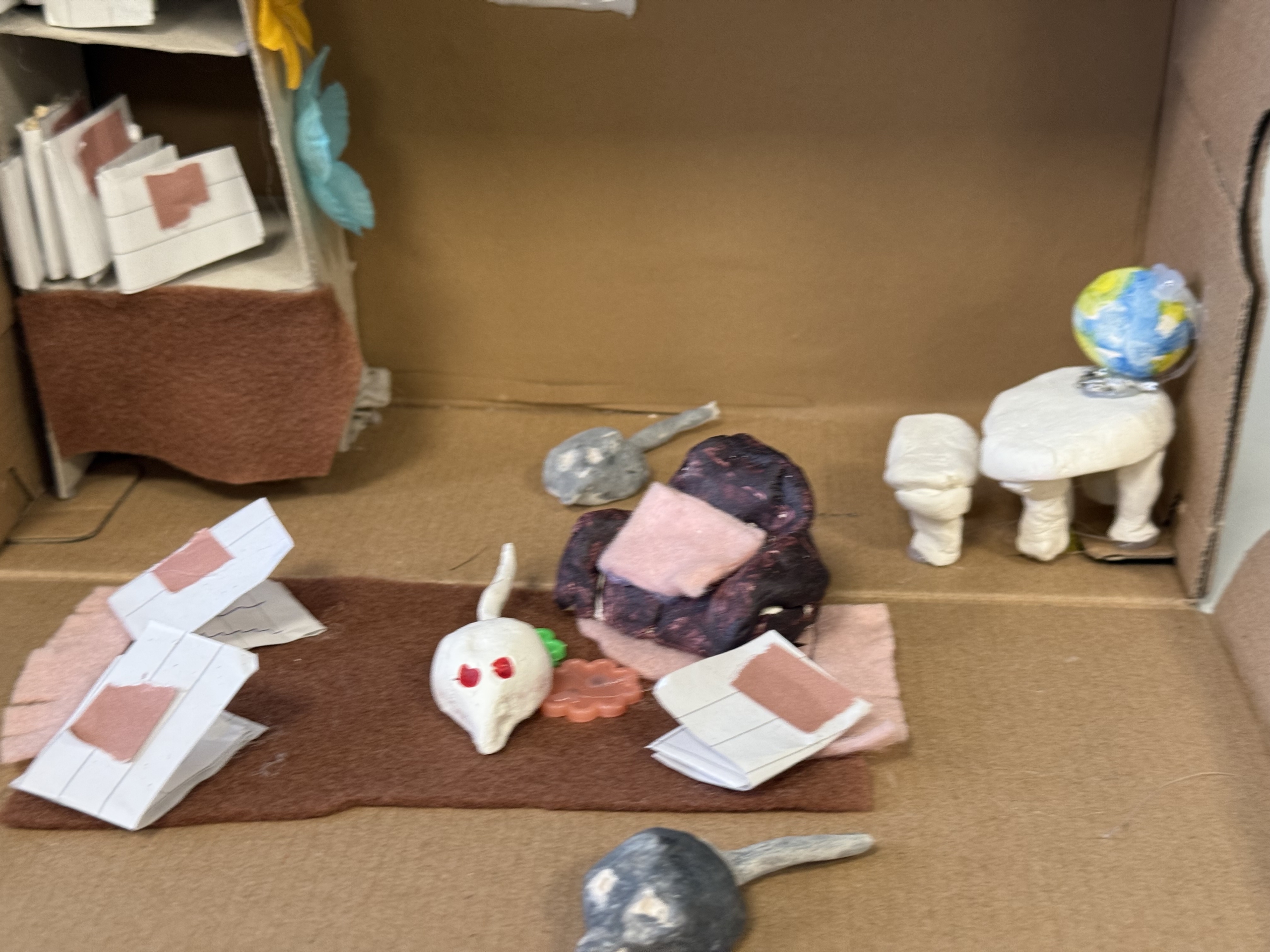 Parallel zum Deutschunterricht, in dem das Buch aktuell gelesen wird, erhielten die Fünftklässler für den Kunstunterricht die Aufgabe, sich eine Räumlichkeit bzw. eine Szene aus dem Buch auszusuchen, um diese mittels eines Kartontheaters darzustellen. Dazu benötigten die Schülerinnen und Schüler einen Schuhkarton und diverses Bastelmaterial. Die Szene durften die Jungen und Mädchen mit vorhandenen Materialien phantasievoll gestalten. Zum Einsatz kamen dabei Pappe, Stoffe, Teppichreste, Schaschlikspieße, Spielzeug u.v.m. Der Kreativität waren hier keine Grenzen gesetzt.