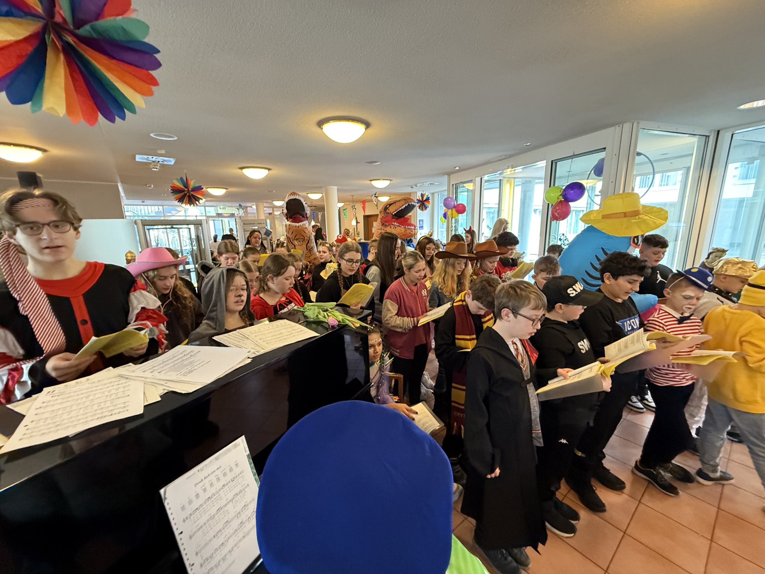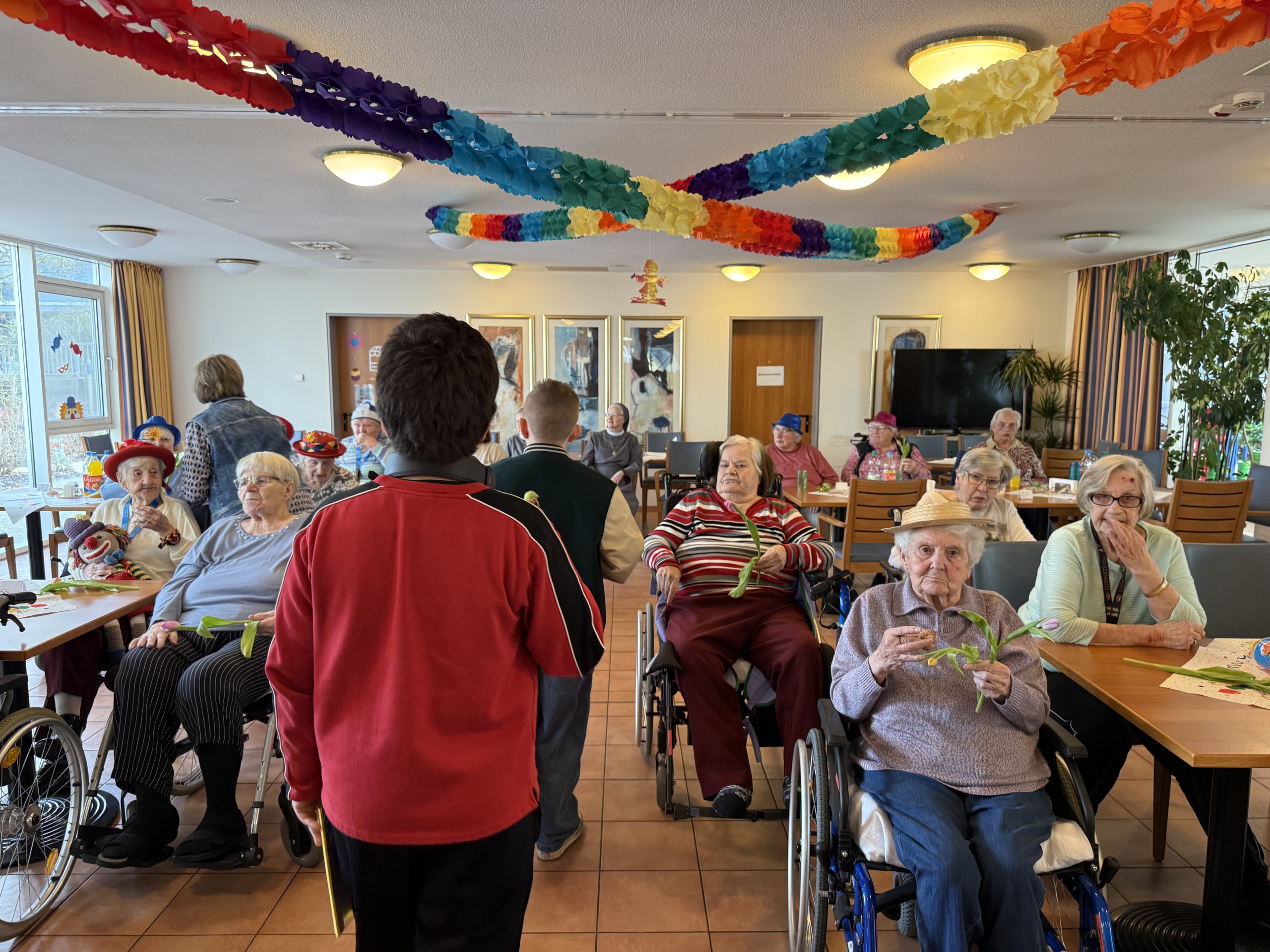 Die Schülerinnen und Schüler versammelten sich am Schwerdonnerstag im Seniorenstift, um den Bewohnerinnen und Bewohnern eine besondere Freude zu bereiten. Mit viel Begeisterung und Herzblut präsentierten die Kinder ein buntes Programm, das sowohl alte Gassenhauer als auch moderne, bekannte Lieder umfasste.