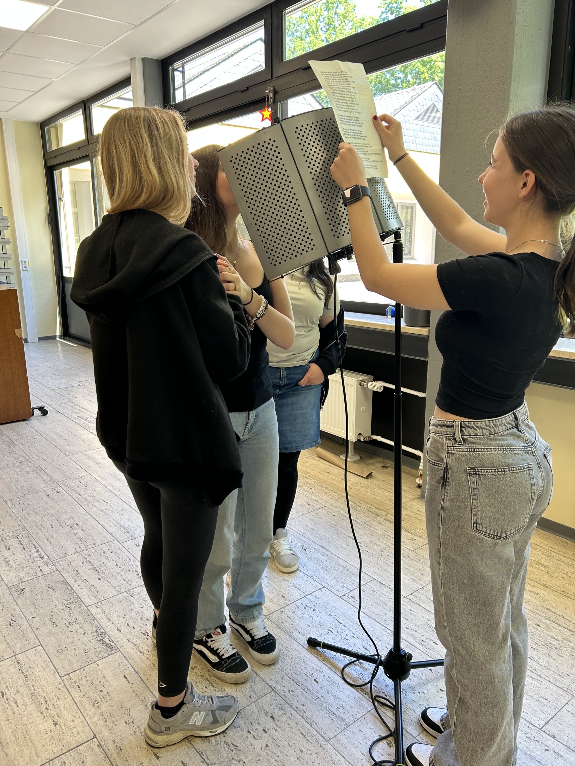 Nun konnte das Tonstudioequipment aufgebaut werden, womit die Schüler*innen ihren Song aufnehmen konnten. Jeder hatte die Möglichkeit, seine Stimme einzubringen und den eigenen Part des Songs zu performen. Der Rap-Künstler unterstützte sie dabei, die besten Takes auszuwählen und den Song zu produzieren. Es war beeindruckend zu sehen, wie viel Teamarbeit und Engagement in die Produktion floss.