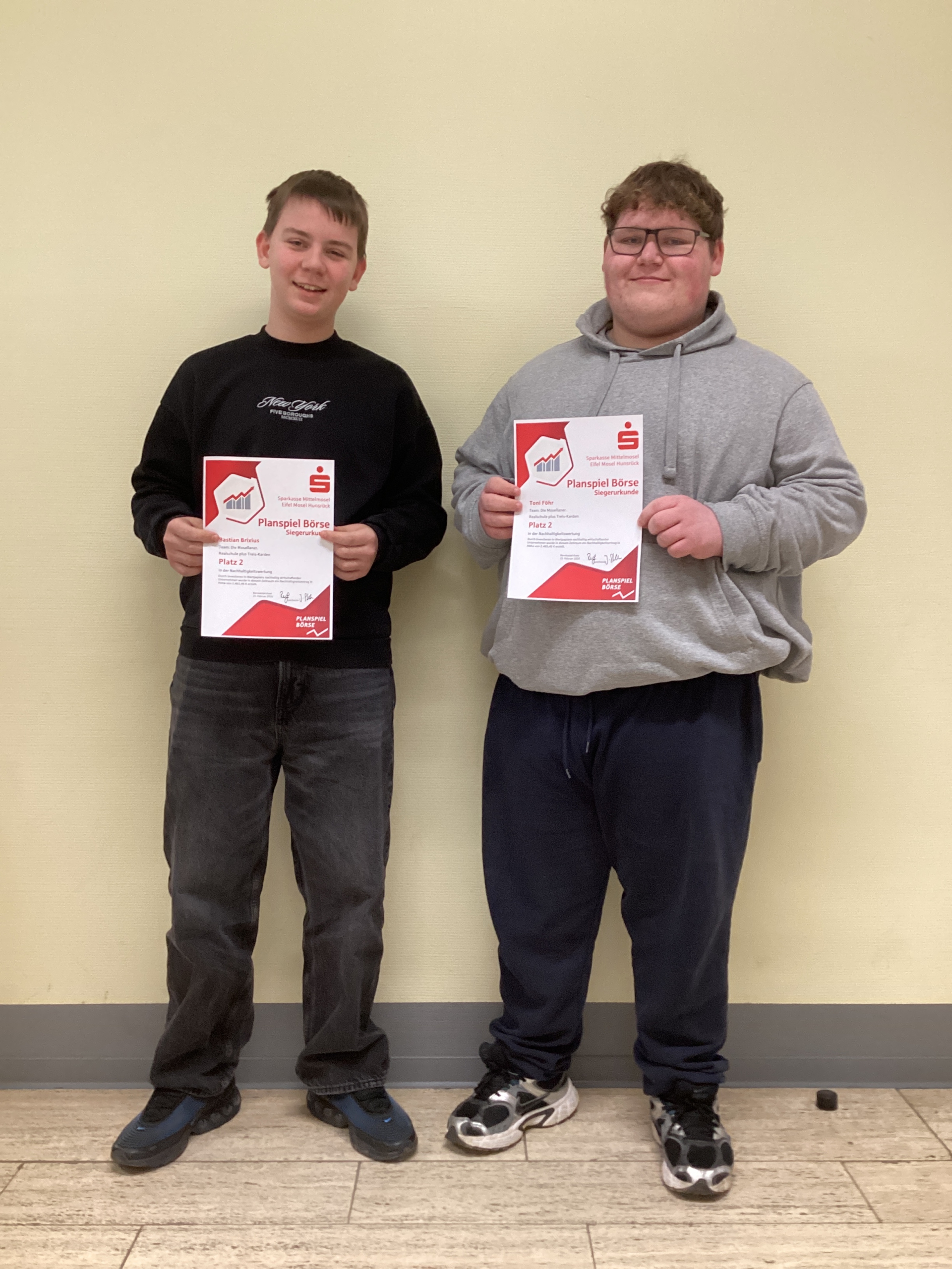 Die Schülergruppe „Die Mosellaner“ von der Konrad-Adenauer-Schule Treis -Karden belegte beim Planspiel Börse der Kreissparkasse Mittelmosel im Bereich der Nachhaltigkeit den zweiten Rang. Bei diesem Börsenspiel erhielten alle Teilnehmer 50.000 virtuelle Euro, die sie in verschiedene Finanzprodukte investieren konnten, welche sich an den realen Börsenwerten orientierten. Die beiden Börsentalente spezialisierten sich dabei auf nachhaltig wirtschaftende Aktiengesellschaften, was sich am Ende für sie auszahlen sollte. So ließen sie über 100 konkurrierende Teams hinter sich. Auch in der Depotgesamtwertung sicherten sie sich einen herausragenden vierten Platz. Die Teamschreibweise mit dem doppelten „l“ rührt daher, dass das Team aus zwei Mitgliedern besteht.