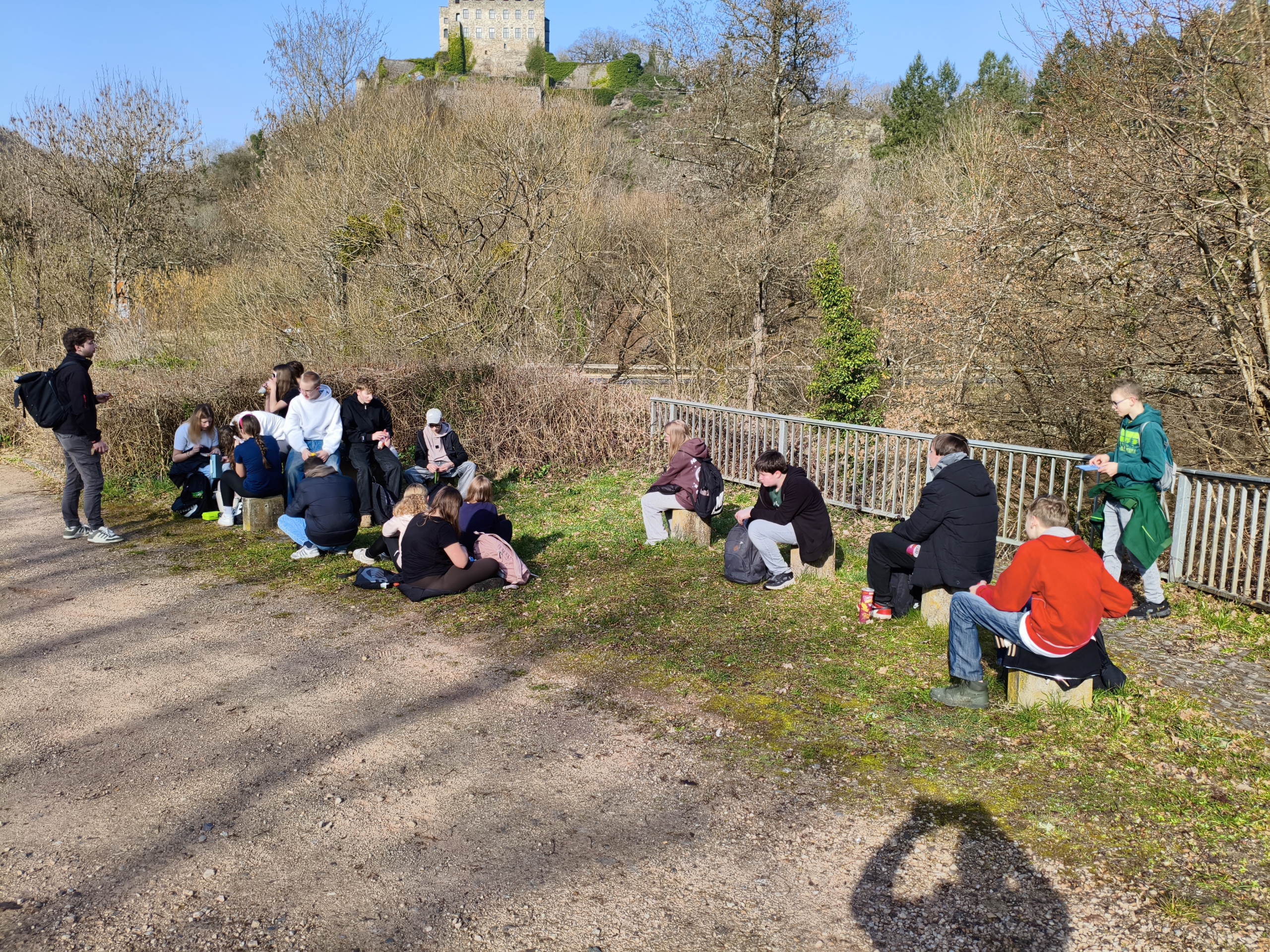 Am 09.03.2026 unternahm die Klasse 8b einen Wandertag zur Burg Pyrmont. Die Strecke begann in Roes und führte die Gruppe durch wechselnde Landschaften: Mal dichte Wälder, mal offene Feldwege. Zwischendurch gab es kurze Pausen, in denen die Natur beobachtet wurde. Bei angenehmem Frühlingswetter legten wir kurz vor der Burg eine Verschnaufpause ein, um Kräfte zu sammeln und die Umgebung zu genießen. Die Aussicht vom Burgstandort bot einen weiten Blick über das Gelände und den nahegelegenen Wasserfall. Nach der Besichtigung machten wir uns wieder auf den Rückweg. Zurück in der Schule angekommen, ließen wir den Tag bei Pommes mit Würstchen langsam ausklingen. Alle kehrten zufrieden, erschöpft aber guter Dinge zurück.